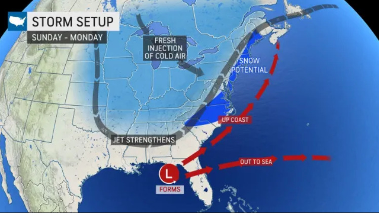 Monitoring a potential East Coast Valentine’s Day snowstorm. Too early to tell how far to the north wintry precipitation, including snow, will spread. The stormโs exact track will determine where the snow will fall.