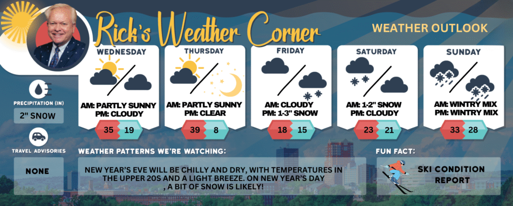 New Year’s Eve will be chilly and dry, with temperatures in the upper 20s and a light breeze. On New Year’s Day, a bit of snow is likely!