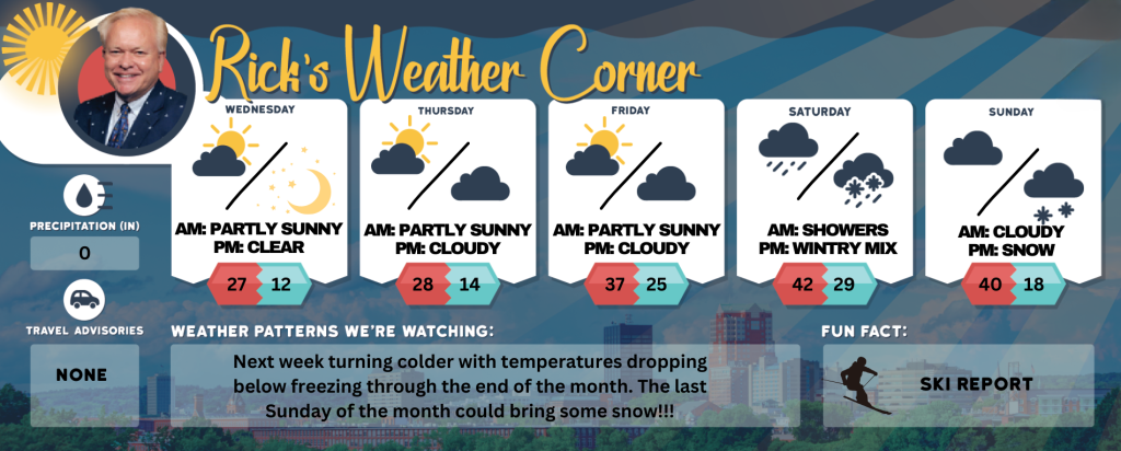 Next week turning colder with temperatures dropping below freezing through the end of the month. The last Sunday of the month could bring some snow!