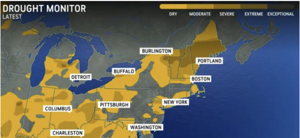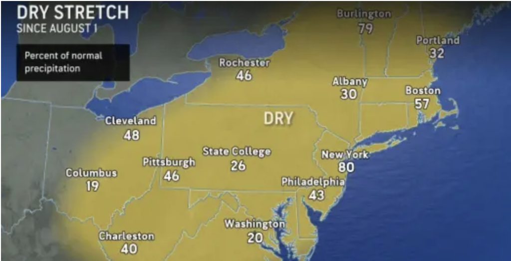 From August 1 to September 7, much of the northeastern United States has experienced rainfall well below the historical average.
