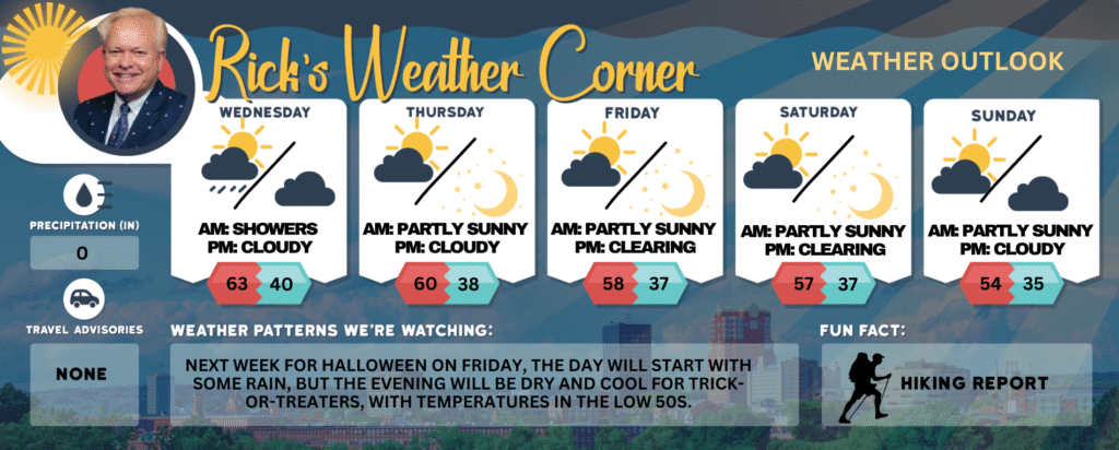 Next week for Halloween on Friday, the day will start with some rain, but the evening will be dry and cool for trick-or-treaters, with temperatures in the low 50s.