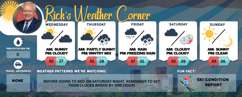 Thursday: Mild with some sun & clouds. High 51 Winds: Light & Variable