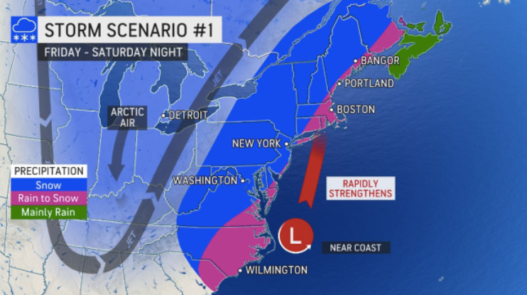A Nor’easter is expected to develop near the East Coast on Friday and track northeastward near New England Saturday. There is uncertainty in the track and strength of the system at this time range. Here are two possible scenarios The first scenario would give us a moderate snowstorm (6″+).