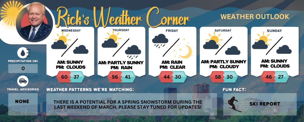 Get ready to welcome the first weekend of Spring with open arms! Enjoy a delightful mix of sunshine and dry weather, as temperatures warm up into the pleasant 50s on Saturday with temperatures in the middle 40s on Sunday. It’s the perfect opportunity to embrace the outdoors and soak in the refreshing vibes of the season!
