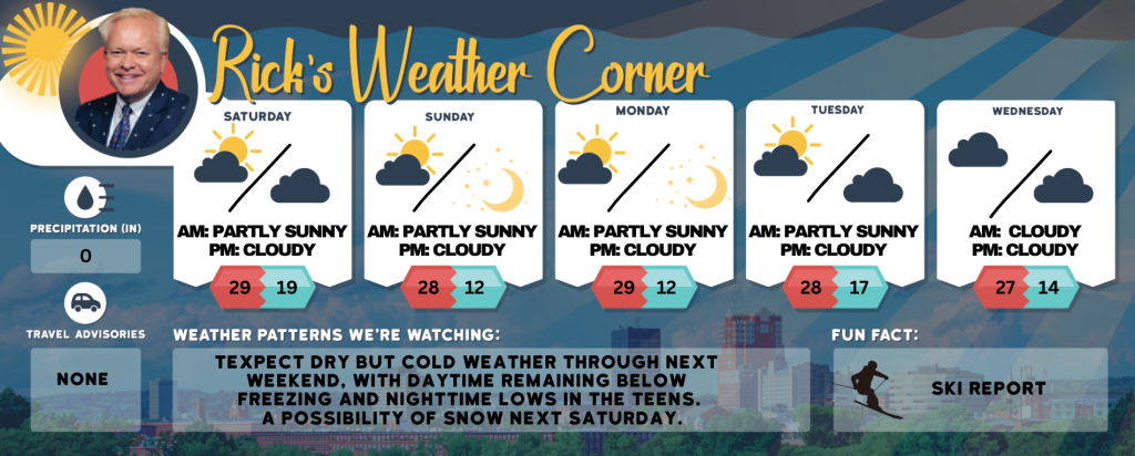 Saturday: Some sun and breezy. High 29 (feel like 17) Winds: WNW 15-25 mph