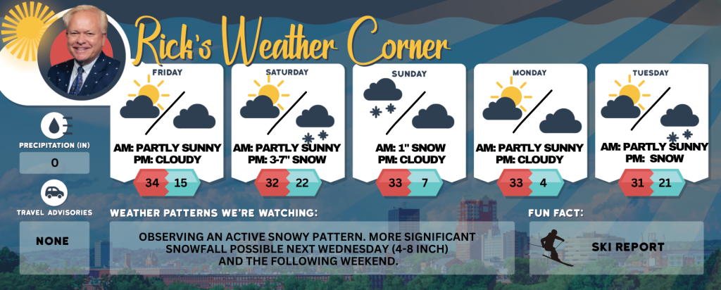 Sunday: Early morning snow (1โ€ณ) with some afternoon sun & windy. High 33 (feel like 25) Winds: NW 10-20 mph