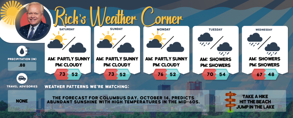 The forecast for Columbus Day, October 14, predicts abundant sunshine with high temperatures in the mid-60s.
