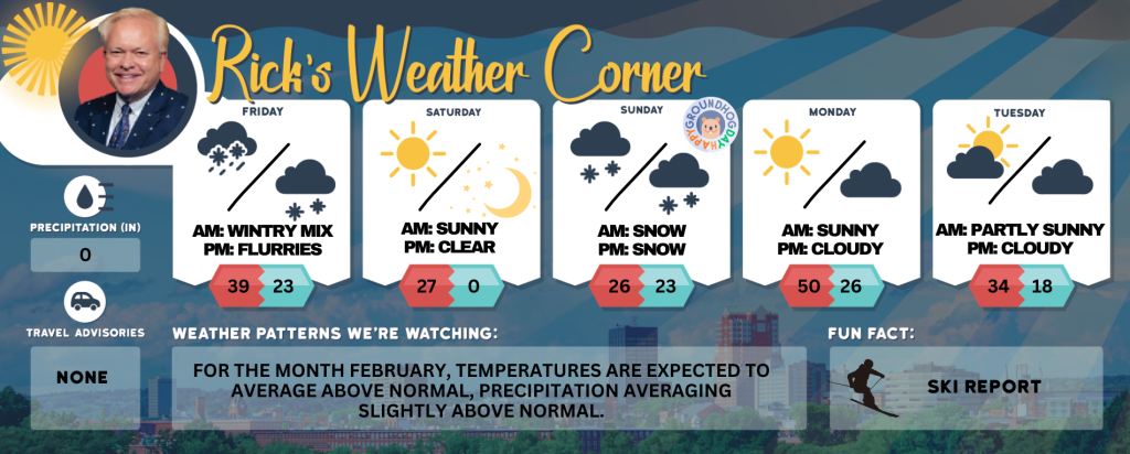 Sunday (Ground Hog Day): Not as cold with snow and flurries late in the afternoon. High 26 (feel like 19) Winds: S 5-10 mph