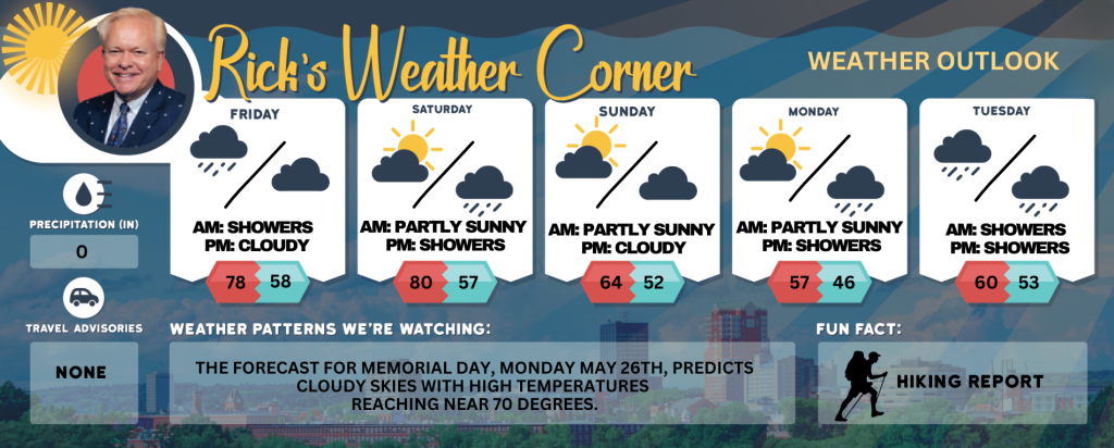 The forecast for Memorial Day, Monday May 26th, predicts cloudy skies with high temperatures reaching near 70 degrees.