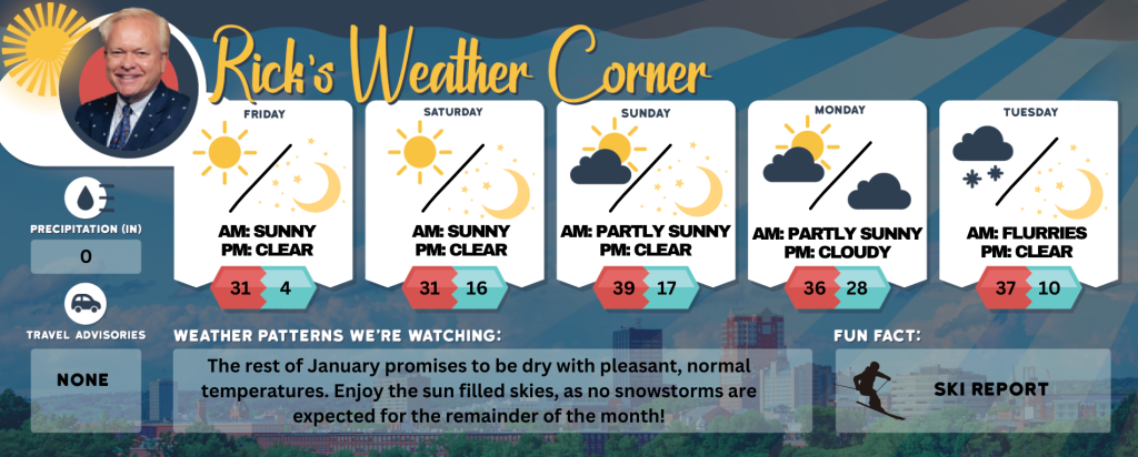 The rest of January promises to be dry with pleasant, normal temperatures. Enjoy the sun filled skies, as no snowstorms are expected for the remainder of the month!