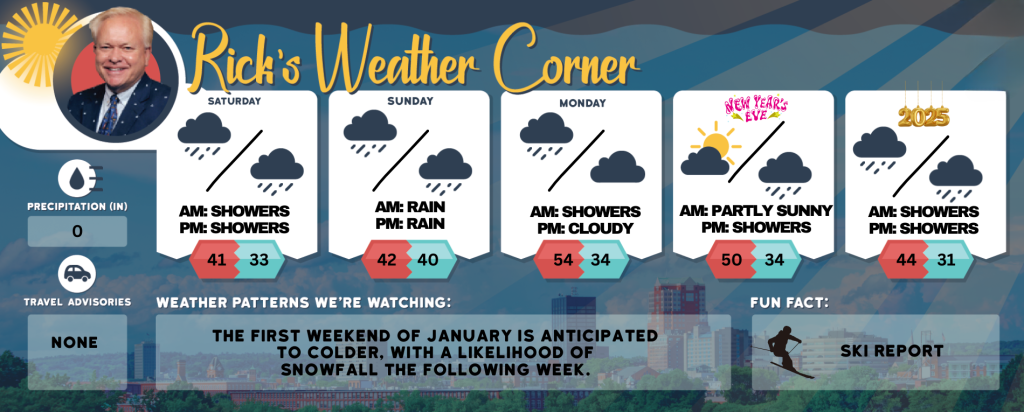 New Year’s Day: Periods of rain, breezy, and not as mild. High 44 Winds: N 10-15 mph