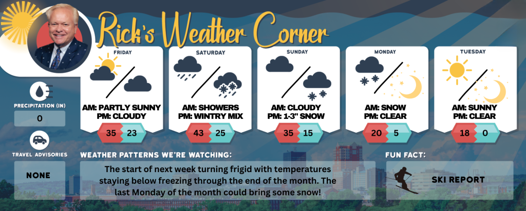 The start of next week turning frigid with temperatures staying below freezing through the end of the month. The last Monday of the month could bring some snow!