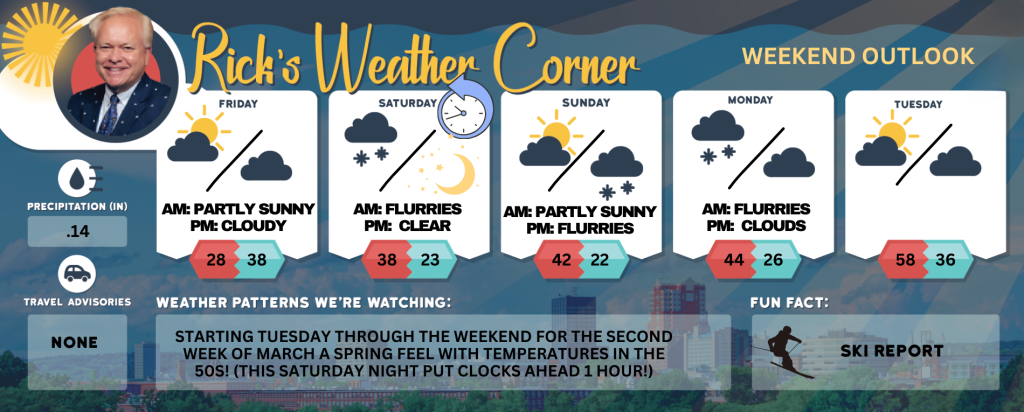 Starting next Tuesday through the weekend for the second week of March a spring feel with temperatures in the 50s! (Saturday night put clocks ahead 1 hour!)