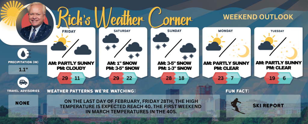 Valentine’s Day Forecast: Expect a mostly sunny day, but be prepared for strong winds with gusts over 40 mph. The high temperature will be 29 degrees, but it will feel like just 14 due to the wind chill. Winds will be coming from the northwest at 15-25 mph. Dress warmly and hold onto your hats!