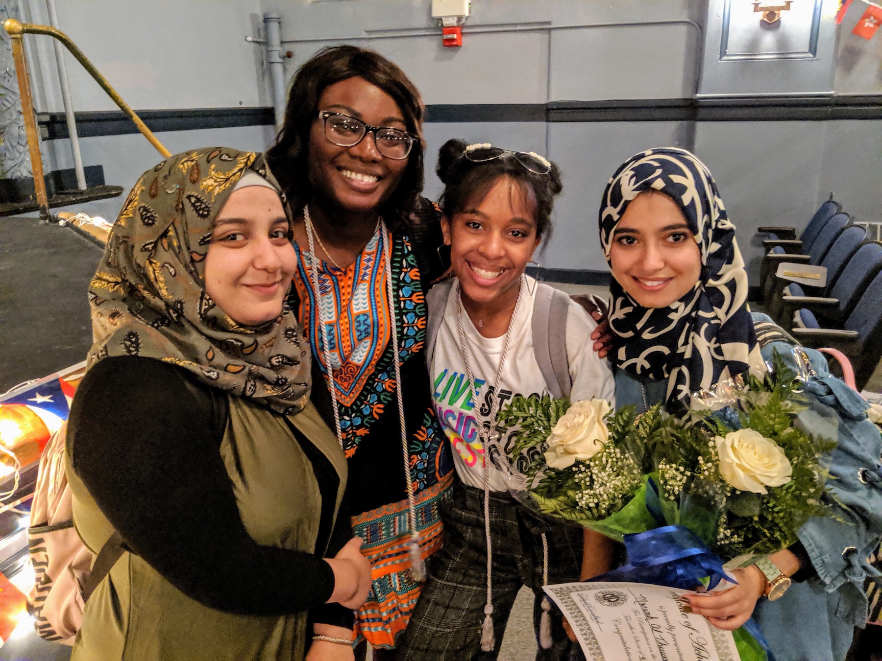 Seniors Ange Kalambay, who came to the U.S. five years ago from the Congo, and Ahd Mohamed, who is Sudanese but grew up in the United Arab Emirates, plan to room together next fall at Colby Sawyer College. Ange will be studying biology and pre-med, while Ahd is pursuing a career in nursing. After the ceremony they celebrated with their other best friends, juniors Zainab Ali โ who wants to be a neurosurgeon โ and Marwah Al Thuwayni, an aspiring future plastic surgeon. Ahd and Zainab were two of the three students, along with Francesa Gomez Acevedo, who this year scored high enough in English proficiency to test out of EL.