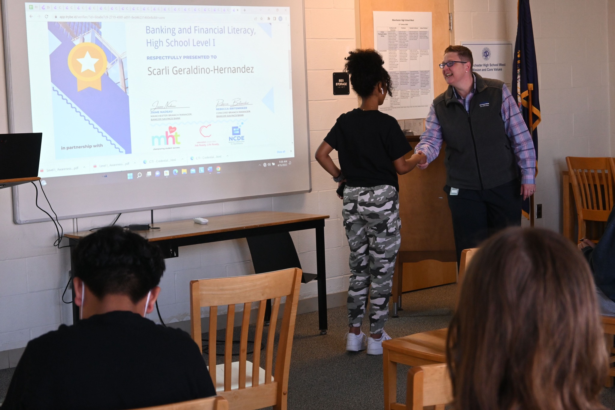 The West financial literacy pilot program was taught by two bank managers from Bangor Savings Bank as a series of seven 90-minute classes. Students who successfully completed the course received $25 to deposit into a newly-opened bank account, half an elective credit and an industry-recognized digital badge, a sort of micro-credential that has value as a form of skills currency for future pursuits.