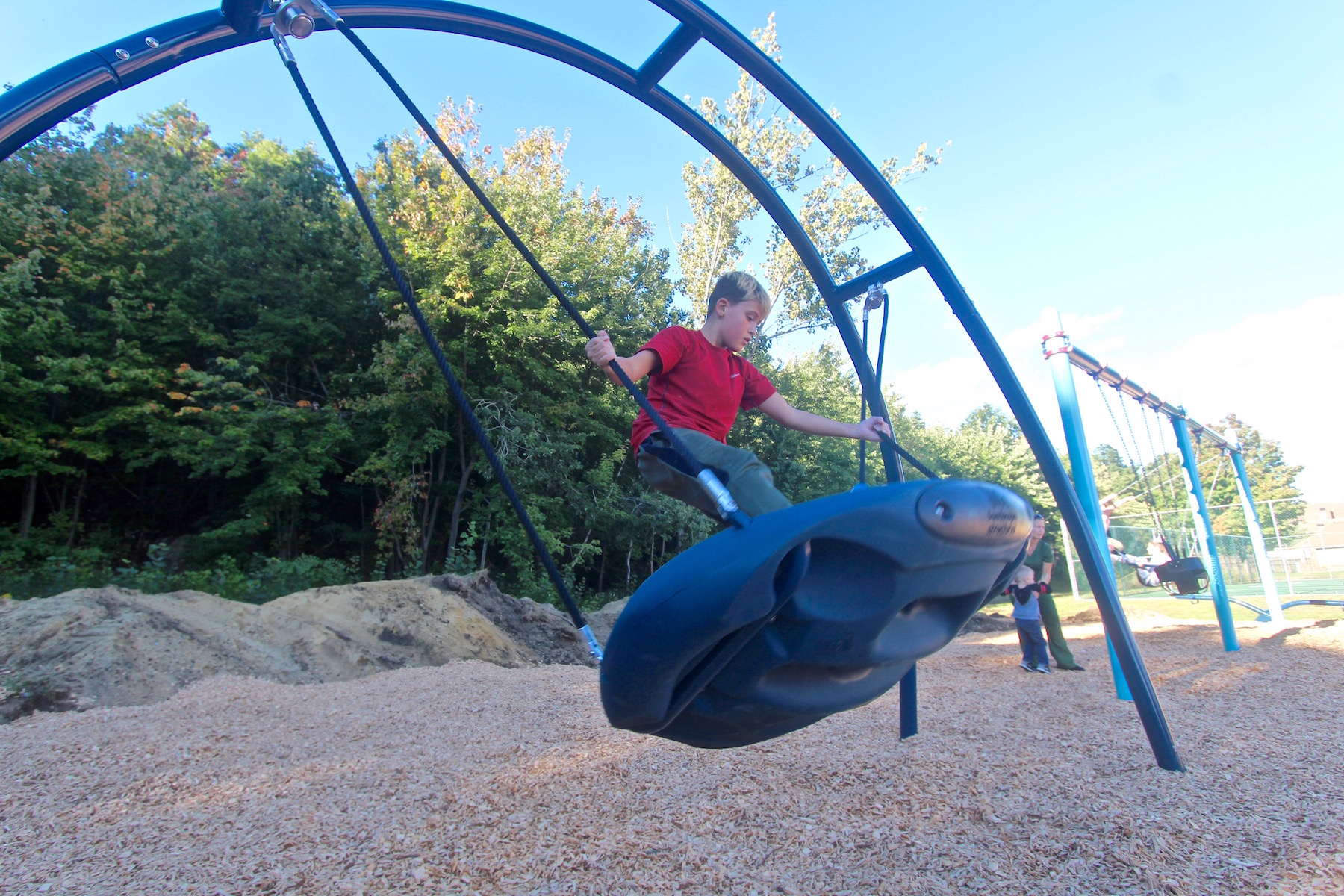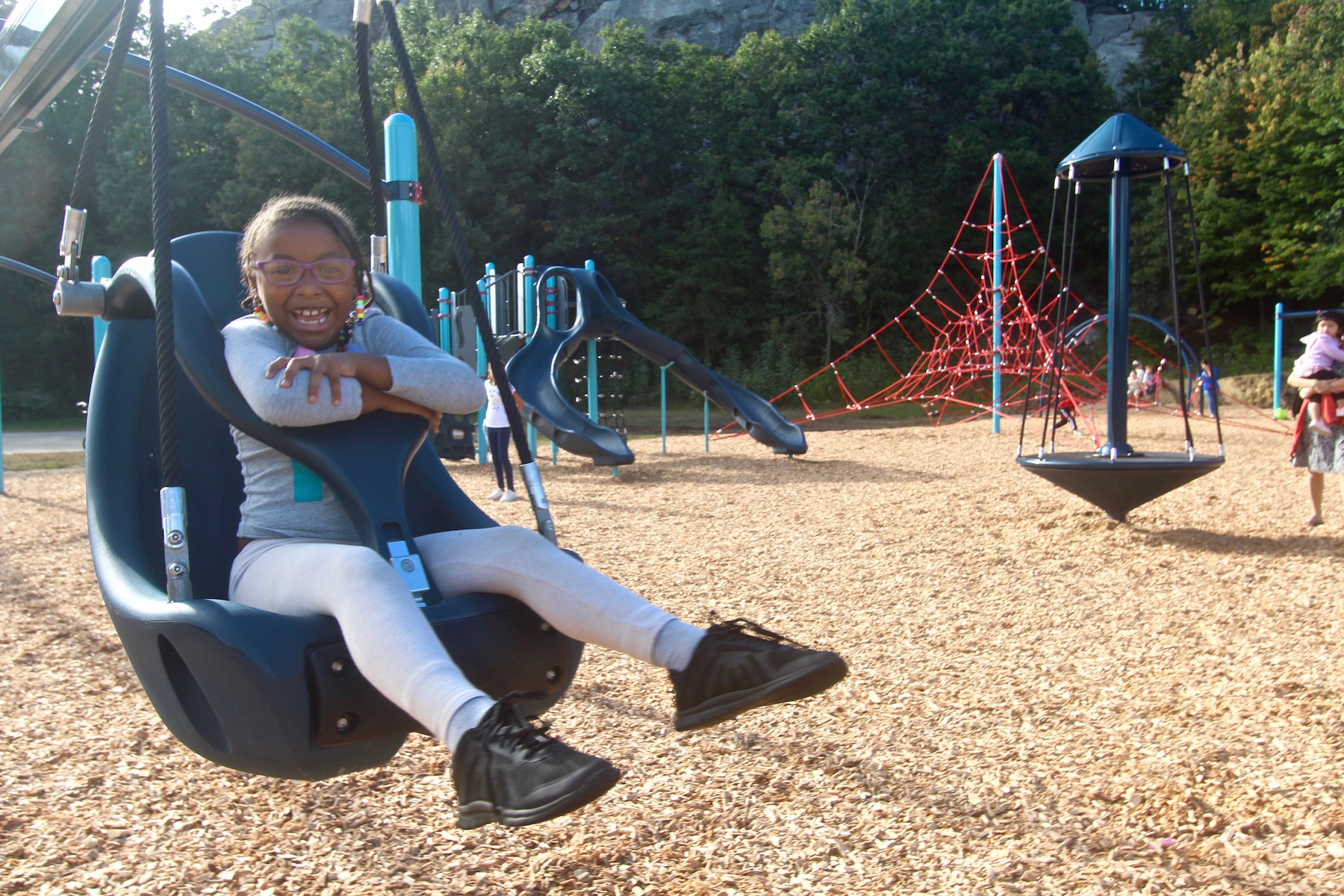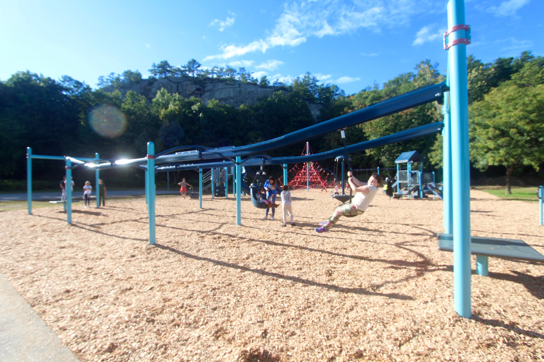 MANCHESTER, NH – Kids were swarming the newly installed playground equipment on Friday at Rock Rimmon Park – kids or all shapes and sizes were gliding and climbing and sliding and running. They were stacked three deep waiting for a chance to try out the track-glider, taking turns on swings, and having some good-old human-kid-powered fun.
