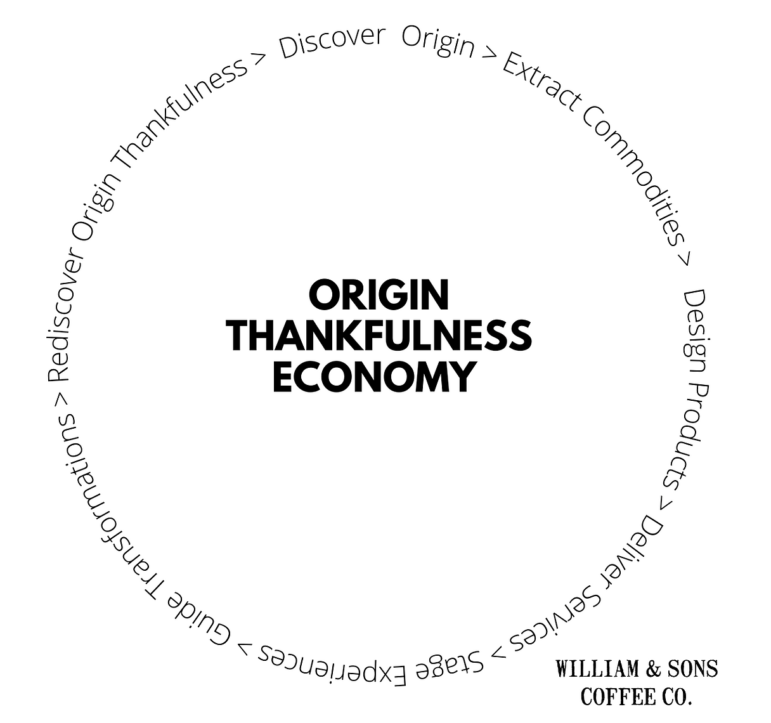 The circular of origin thankfulness starts with the step of “discover origin,” then moves to extract commodities, design products, deliver services, stage experiences, guide transformations, and closes the circle at rediscovering origin thankfulness.