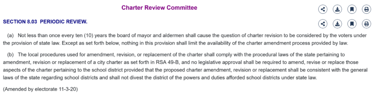 Under Section 8.03 of the Manchester City Charter (see above), the city is required to ask voters at least once every 10 years whether to establish a charter commission to investigate either proposing amendments to the current charter or proposing an entirely new charter.