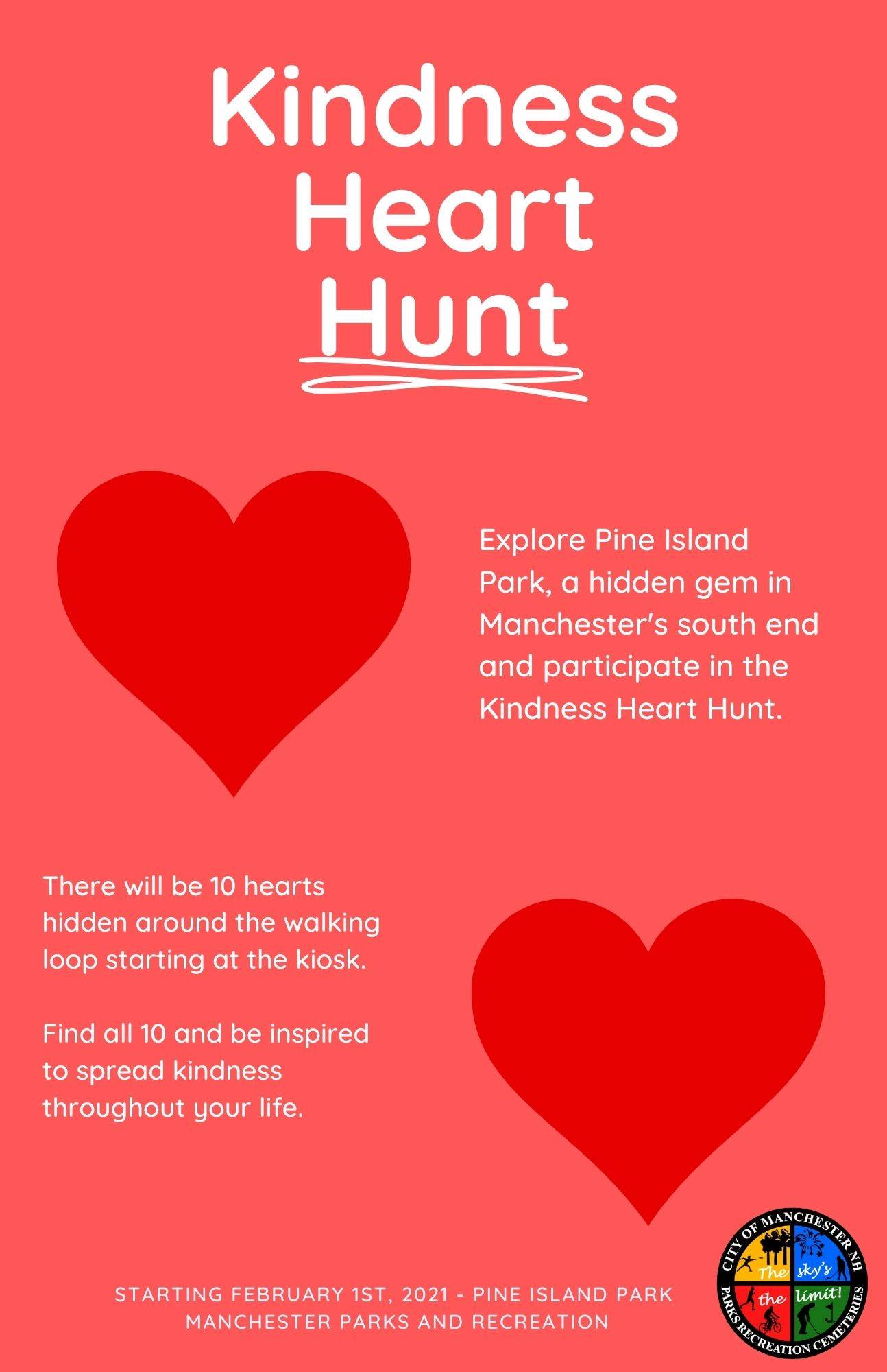 Explore one of Manchester’s hidden gems, Pine Island Park. Ten hearts will be hidden around and along the walking loop. The hearts will have inspirational quotes and random acts of kindness on them. Find the hearts and spread kindness throughout your day. The hearts were hidden on February 1 and they will be up until February 18. Check out the Manchester NH Parks & Rec Facebook page for more info.