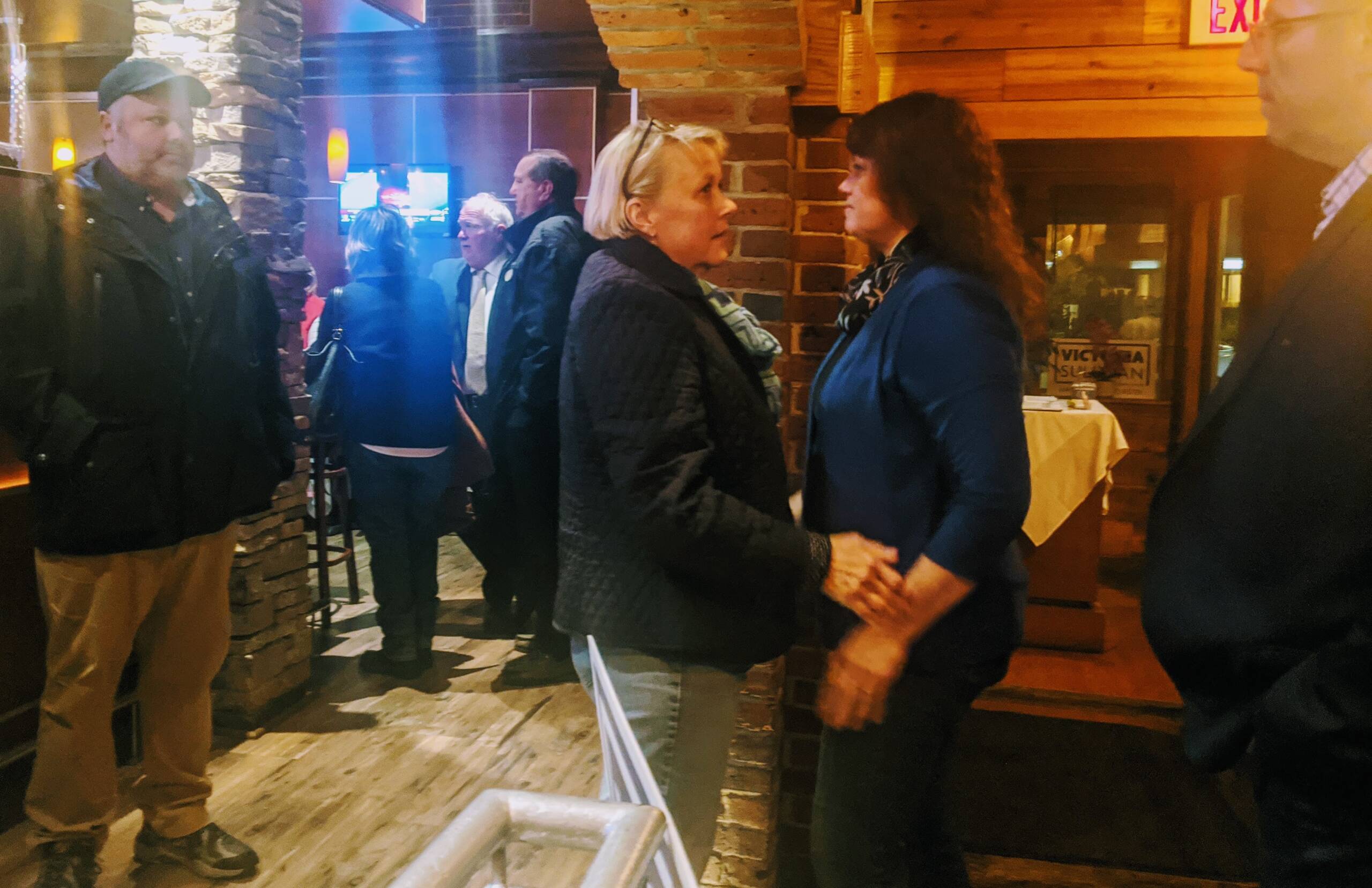 Tammy Simmons, former Manchester Republican Committee chair, was the first to greet Victoria Sullivan Tuesday night as she arrived to concede the mayoral race and address supporters at Soho Bistro. Photo/Carol Robidoux