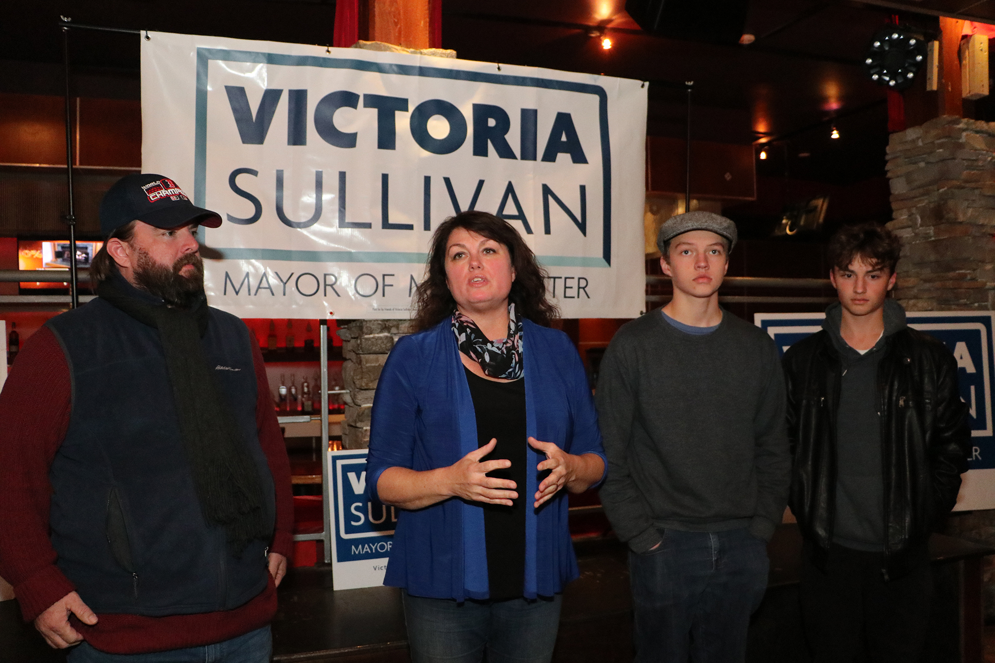 Victoria Sullivan lost her run to be Manchester Mayor on Tuesday evening. She spoke to supporters, volunteers and campaign staff at Soho Bistro & Lounge downtown. She is with her husband Buddy, at left, and sons Seamus, 15, and Buddy, 16. Photo/Allegra Boverman