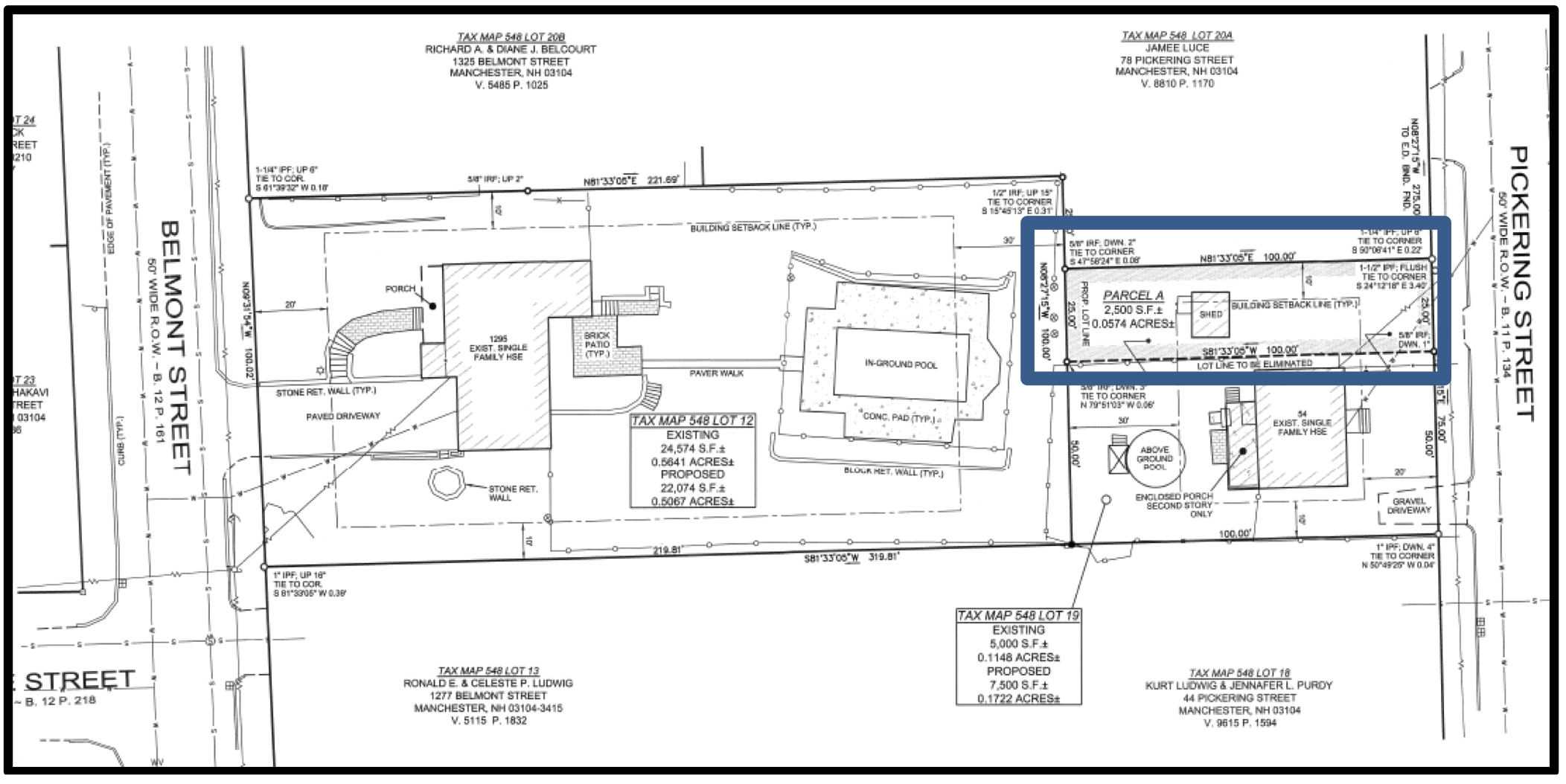 Applicant is submitting subdivision application to adjust the lot lines between 1295 Belmont Street (Map 548, Lot 12) and 54 Pickering Street (Map 548, Lot 19) in order to make the lot at 54 Pickering Street a conforming lot of record.