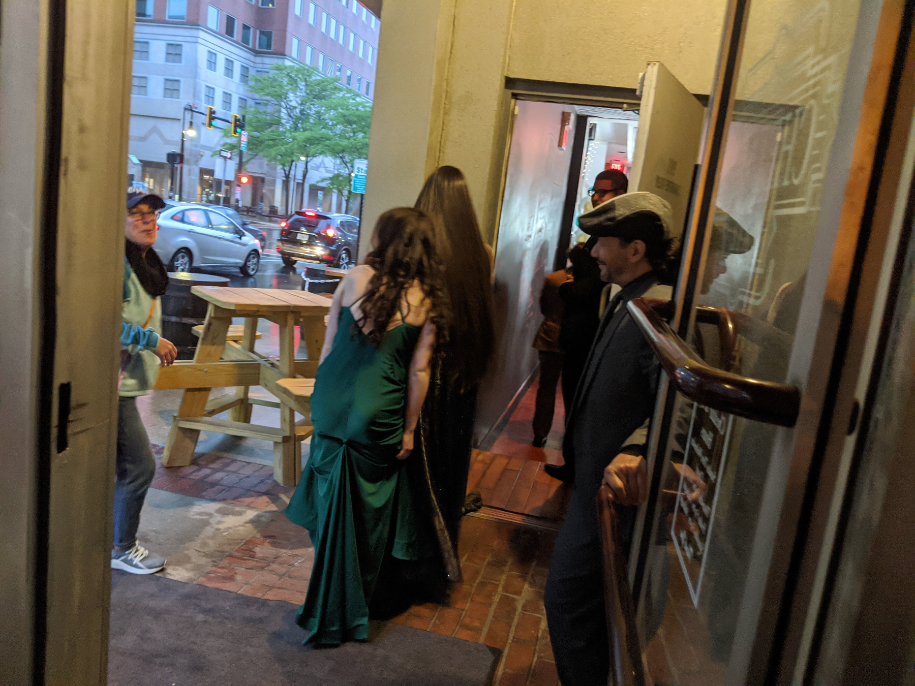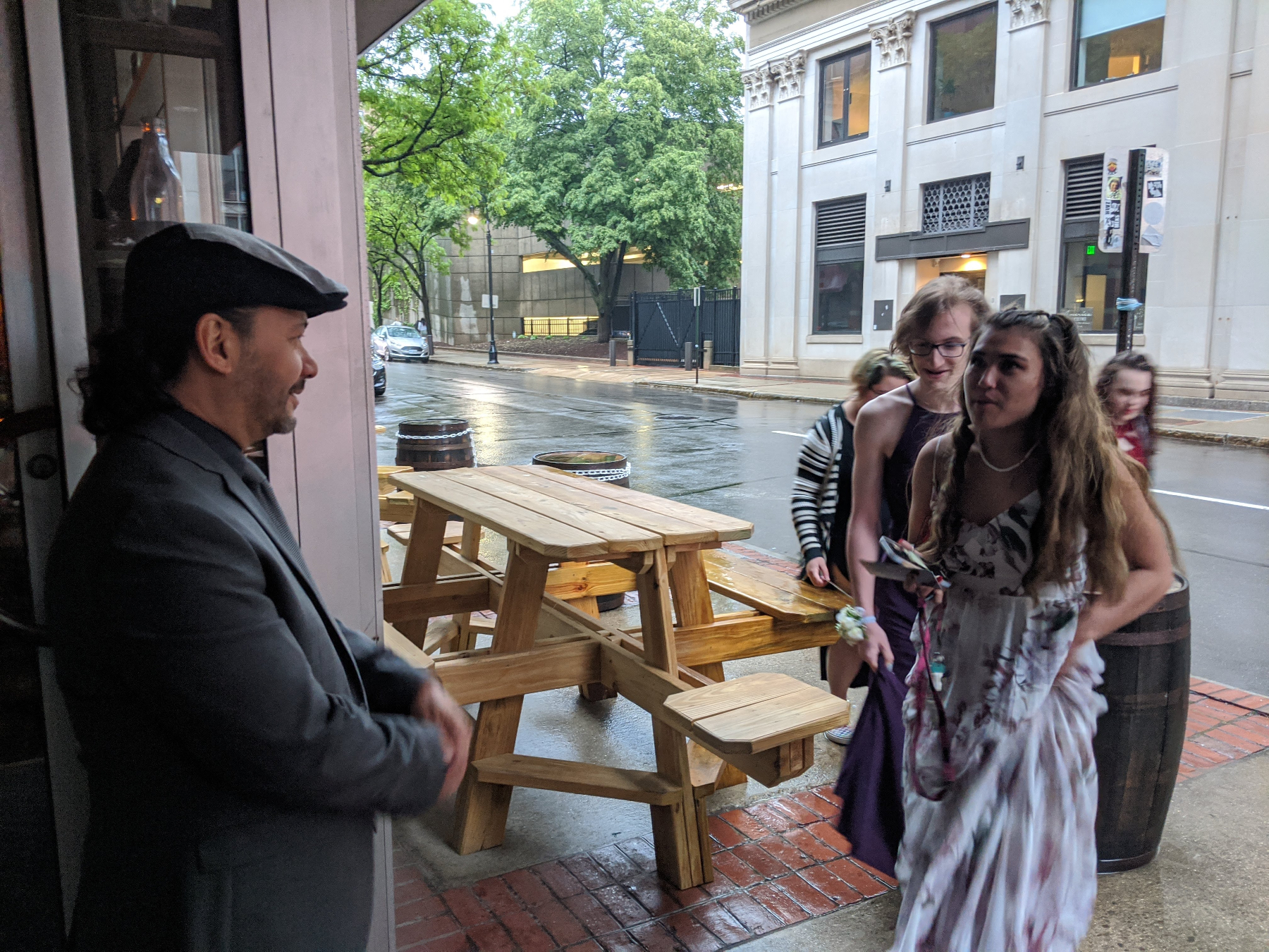 Liu Vaine greeting MST students arriving for a makeshift prom night at Cheddar & Rye. Photo/Carol Robidoux