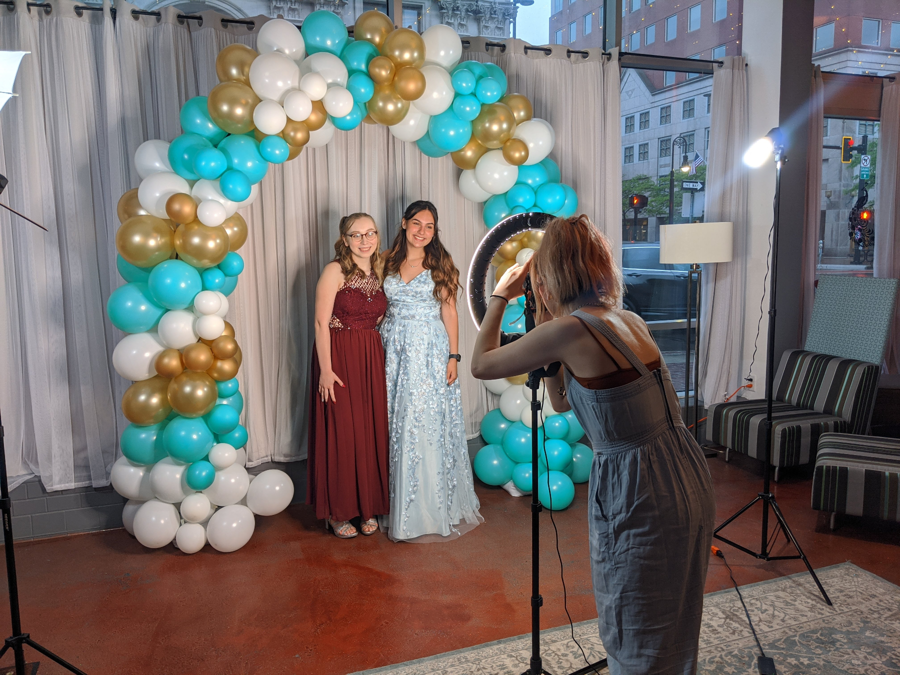 And Vaine was able to recruit one of his employees from another of his eateries to be official photographer, no charge to the teens. SteeVee Parsons who works at CodeX in Nashua, captured everyone in a variety of poses, from individuals to groups. Vaine’s wife, Eryka Machado created an elegant turquoise-gold-and-white balloon arch as a backdrop. A fleet of chaperones were recruited. A playlist was assembled. Golden tickets were printed.