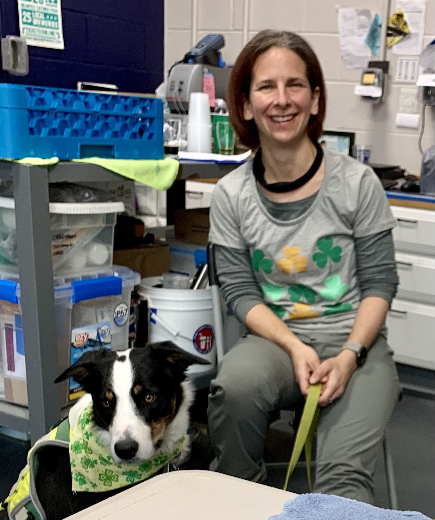 A decade after graduating, Parker decided to leave the balmy shores of NH for exotic adventure at McMurdo Station in Antarctica where she spent 3 years as Supervisor of Laboratory Operations. Asked if she ever misses Antarctica, she replied “Sometimes,” then described how dietary options were so limited there that visions of food came to linger in the thoughts, even dreams, of almost all the staff. As she related this, she reached into a climber’s chalk bag at her belt and retrieved a treat for Sprite, who took it happily.