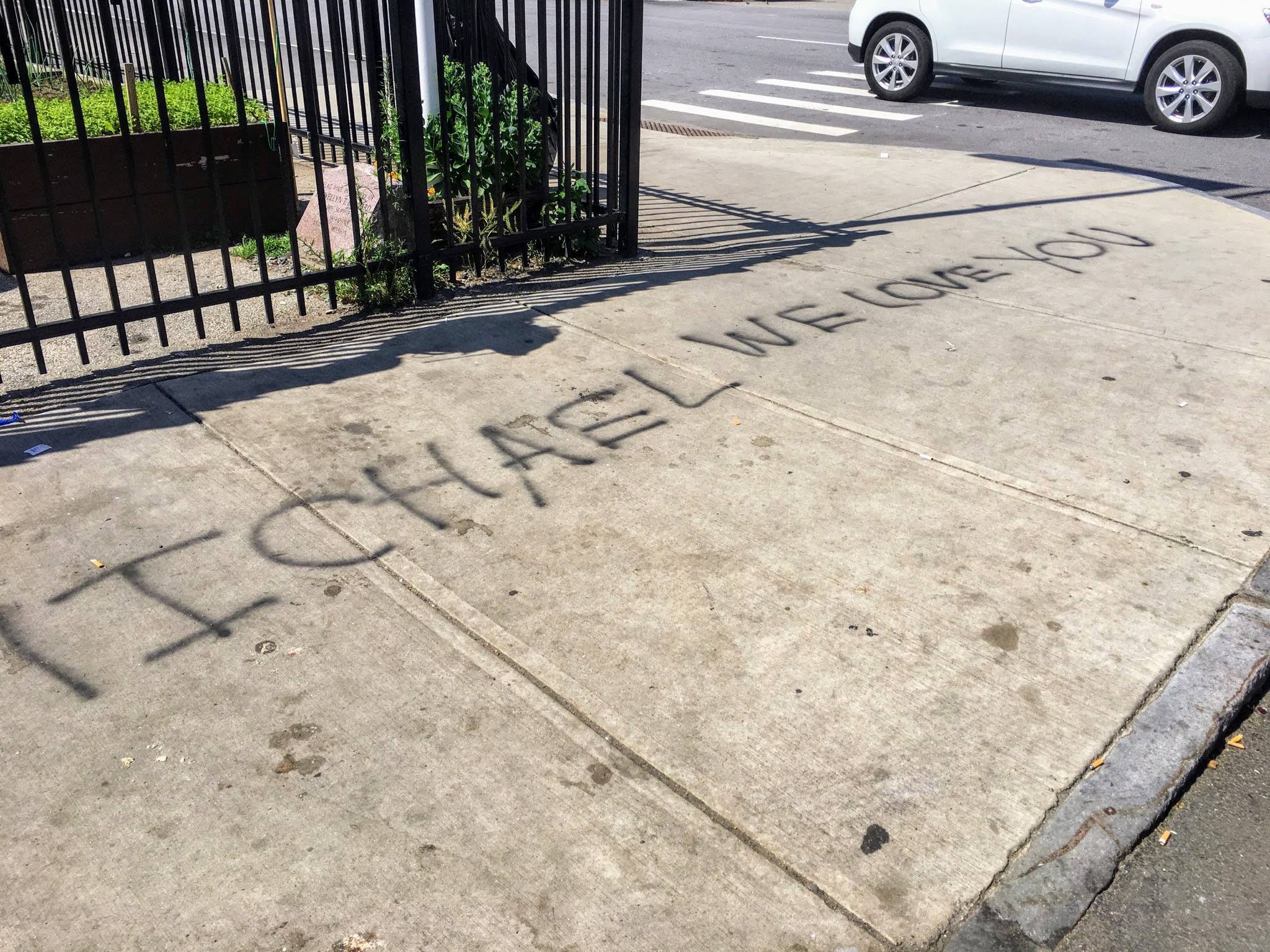 A tribute scrawled on the sidewalk near the shelter for a man who was injured in an assault Monday night. Photo/Pat Grossmith