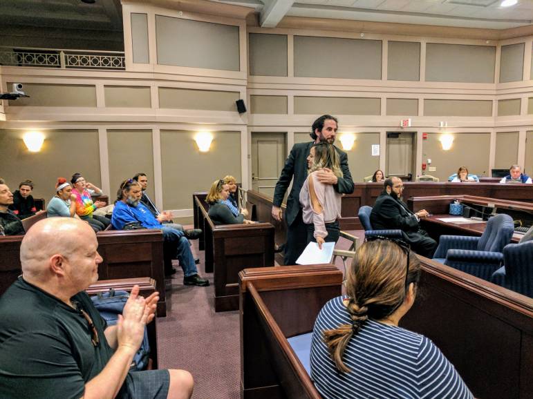Maria Pintos Quiroga gives a hug to Matt Courchesne after appearing before the joint BOA/BOSC board in April of 2017 to talk about how 10 years ago bullying in middle school led her to give up on school, and herself (Read her testimony below). With the help of the H.O.P.E. program she was able to turn things around, graduate early, and is now working and looking forward to returning to school to continue her education. Photo/Carol Robidoux