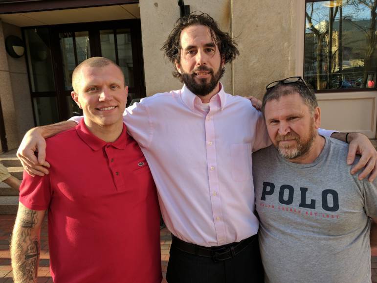 Matt Courchesne, center, flanked by Joey Bachand, left, and his dad, Michael Bachand, after an April 2017 joint BOA/BOSC meting at City Hall where Joey spoke about the positive influence H.O.P.E. had on him (Read his testimony below). He was one of the first students to begin working with the H.O.P.E. program when he was in 7th grade. With the help of “Mr. C” Joey was able to get his GED and is now successfully employed at Coca-Cola. Photo/Carol Robidoux