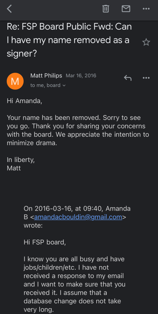 So in March of 2016, I emailed the Board of the FSP and asked to have my name removed from their roster. I did not publicize this exit, and I knew that the Board would not want to publicize it either. I was satisfied to know that I had done the right thing. I did not feel that I owed a status update to anyone else.