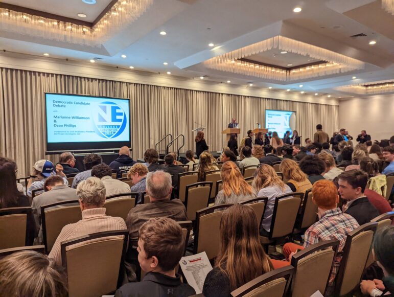 MANCHESTER, NH – On Monday, Jan. 8, Democratic Presidential Candidates Dean Phillips and Marianne Williamson took part in a Democratic debate during New England College’s College Convention at the Hilton Doubletree Hotel in Manchester.