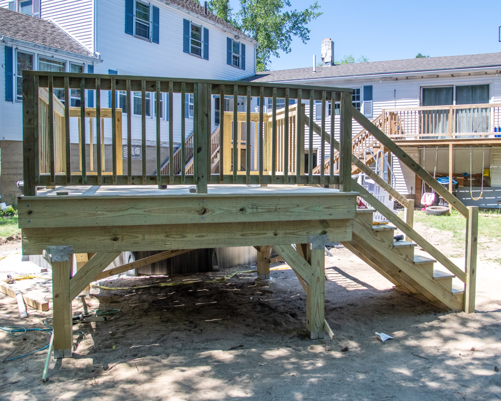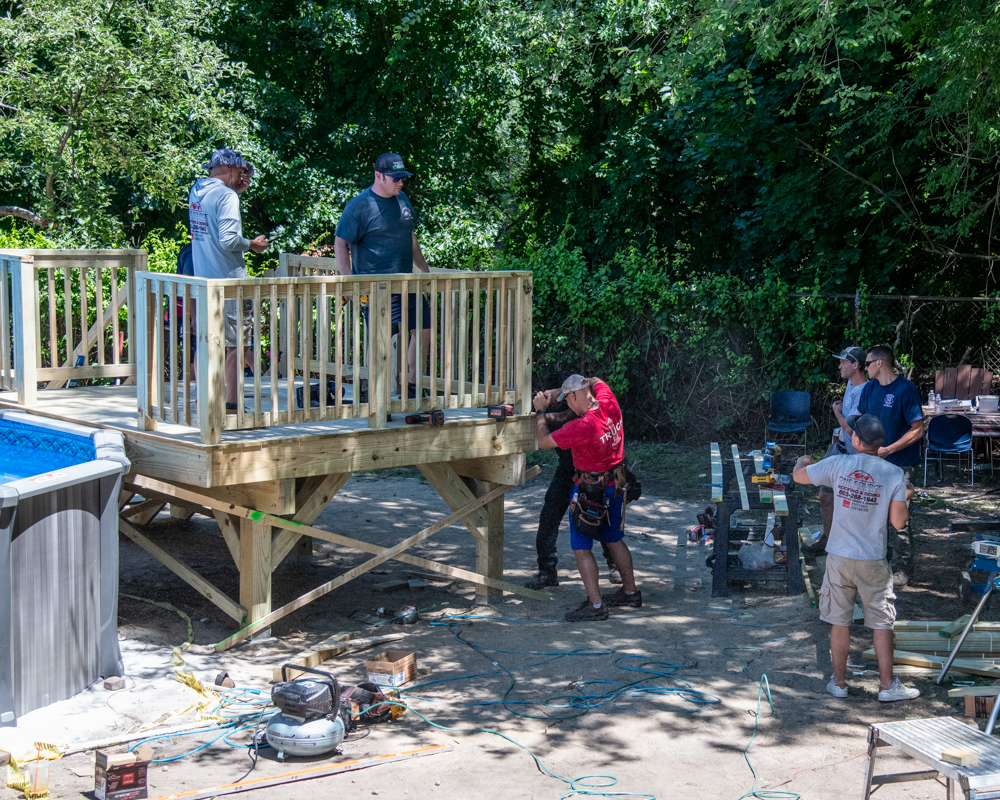 More than a dozen current and retired firefighters from IAFF 856 started the deck early Friday morning at the childโs home. Crews began cutting the lumber provided at a reduced rate by Mast Road Lumber.