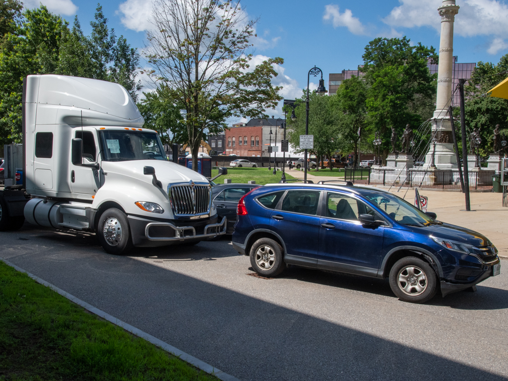 He said he was stopped at a red light at the intersection of Kaye and South Willow streets – across from the Mall of New Hampshire — when a beeping sound caught his attention. The sound was coming from a white semi-truck, with no trailer, which was behind a blue Honda CRV in the southbound lane on South Willow Street.