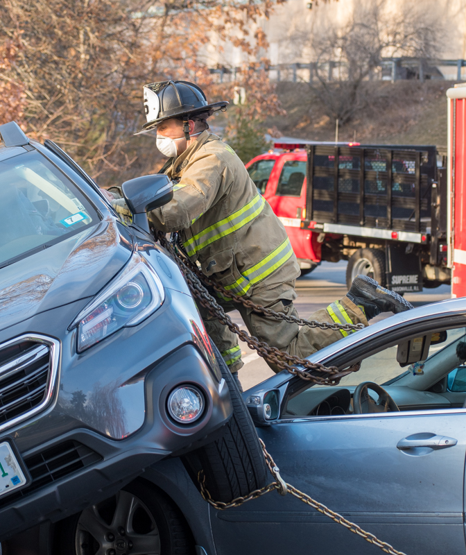 The driver of the vehicle on top was unable to get out and the vehicle was very unstable. Manchester Deputy Fire Chief Matthew Lamothe called for the building collapse unit and Rescue 1 which have special cribbing, jacks, and stabilization tools.