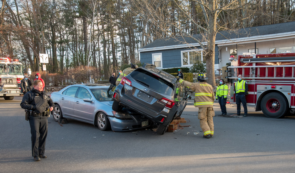 MANCHESTER, NH – No one was seriously injured in a two-car crash that resulted in a spectacular visual –one car in top of the other – and leftaleft one driverrdriver trapped.