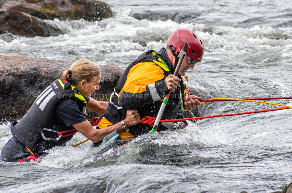 The woman was fastened to the firefighter and, using ropes to navigate the strong current, was brought to safety.