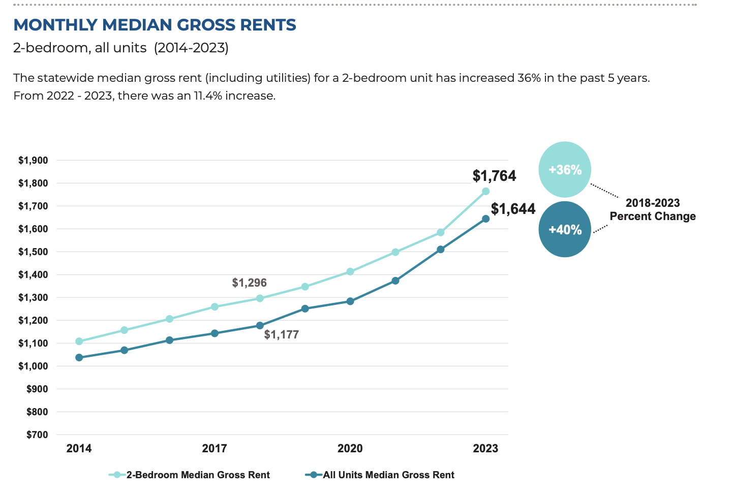The same report also said for that time period there was a statewide annual increase of 11.4 percent in monthly median gross rent for two-bedroom units.