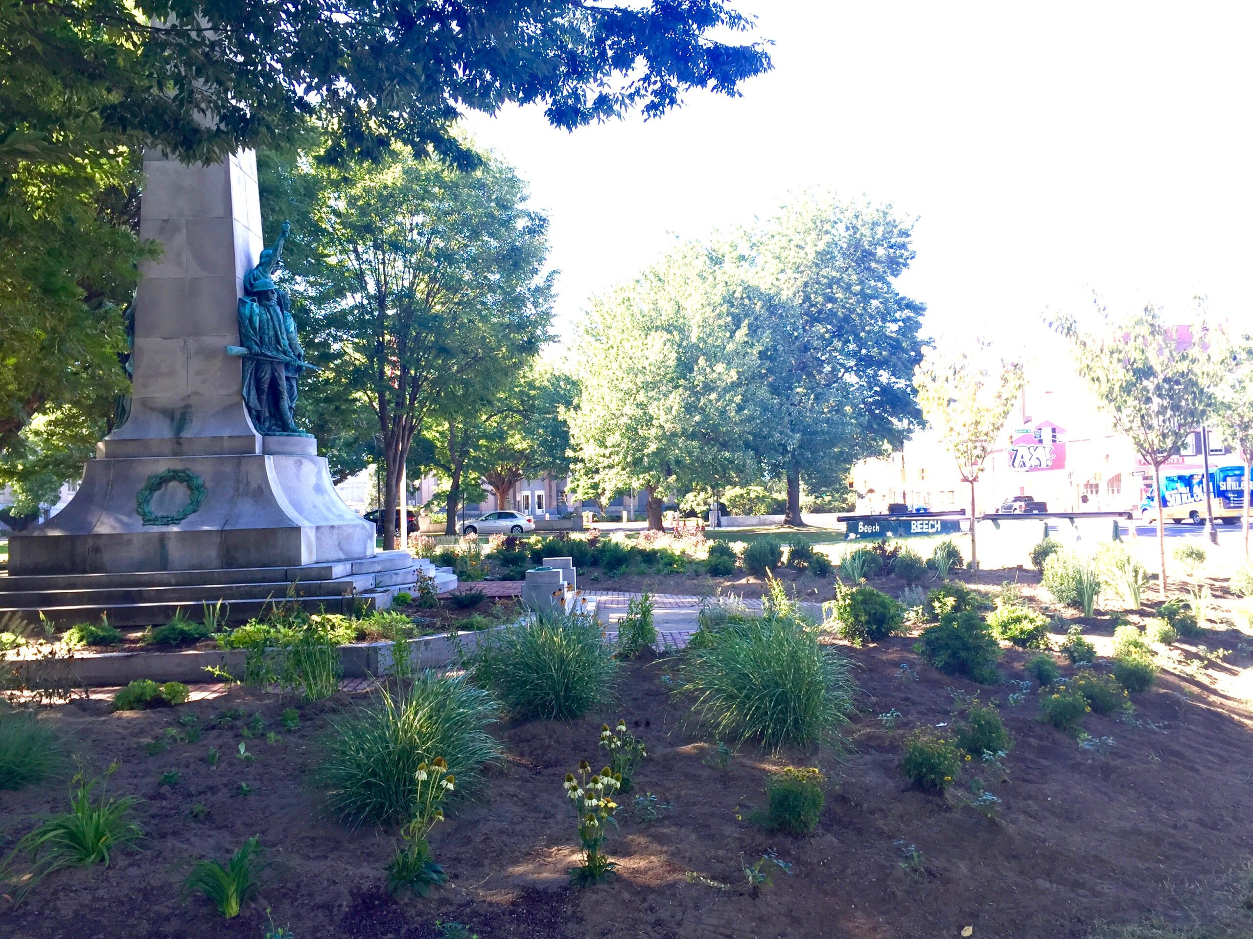 Victory Park is located across the street from the Manchester Public Library. Metered parking is available on street and in the adjacent parking lot, and there is also a city parking garage across the street.