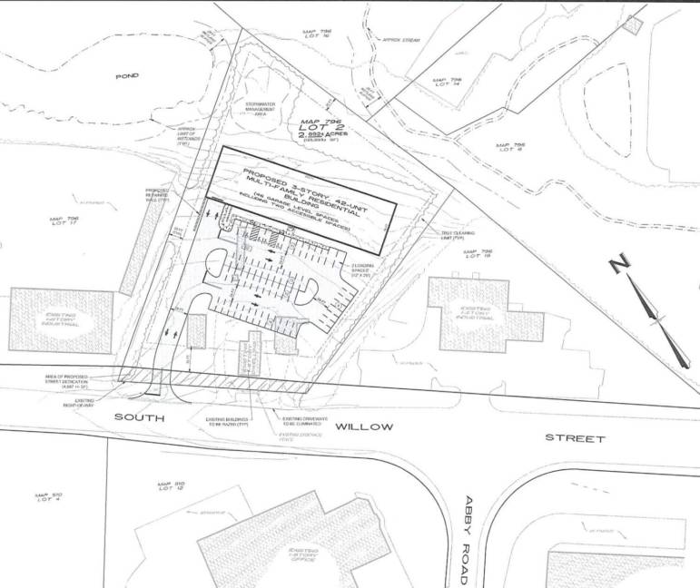 The proposed building will be set back several hundred feet from South Willow Street, with one floor of the building reserved for a garage and the other three floors of the building used for condominium-ownership style units.