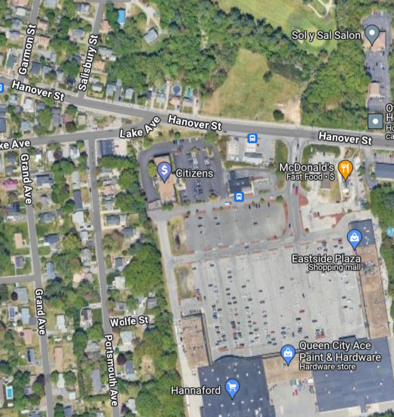 The property is located at Hanover and Lake, near the Hannaford plaza seen here from above. Screenshot/Google Maps