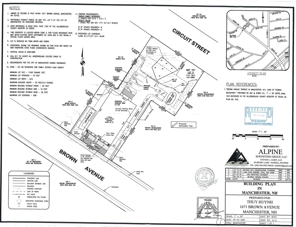 Applicant proposes to repurpose a former union hall by using 1,711 SF to create one new dwelling unit and using the remaining 1,711 SF to establish a nail salon, with business parking in a residential zoning district where the proposed parking lot is within 2โ of a wetland where 25โ is required, without parking bumpers for spaces within 10โ of the property line, with an 8โ landscaped perimeter around the western parking spaces where 10โ is required, and with a proposed new accessible ramp with an 8โ side yard setback where 10โ is required and seeks a variance from sections 5.10(H-6)3 Beauty and Barber Shops, 10.02(F) Business parking in a Residential District, 6.09 Minimum Setback from Wetlands, 10.07(K)1 Parking Bumpers, 10.07(G) Landscaping and 6.03(C) Side Yard Setback.